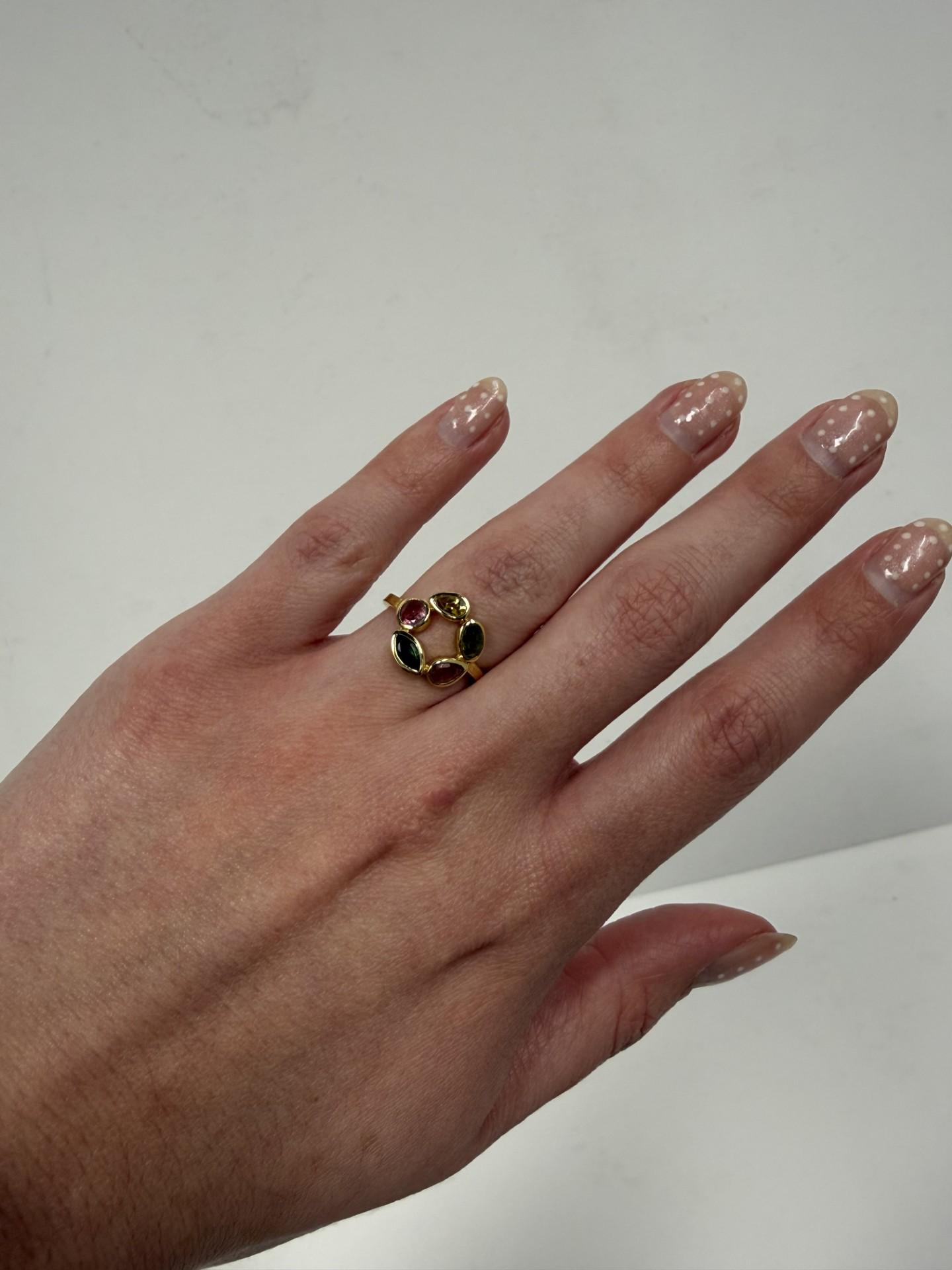 Zilver vergulden ring bloem vorm, gezet met gekleurde toermalijn stenen.