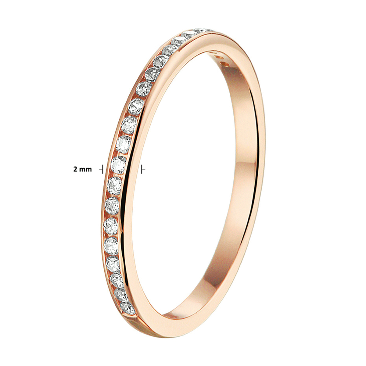 Beschrijving: Stijlvolle rosegouden aanschuifring met een schitterende rij van zirkonia en een poli afwerking. Tip: Combineer deze ring met andere aanschuifringen voor een subtiele en elegante look.