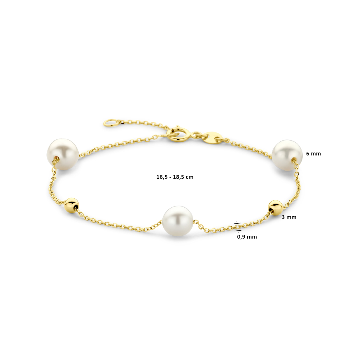 14k Geelgouden armband uitgevoerd met bolletjes en parels. De armband heeft draaglengtes van 16.5-18.5cm.