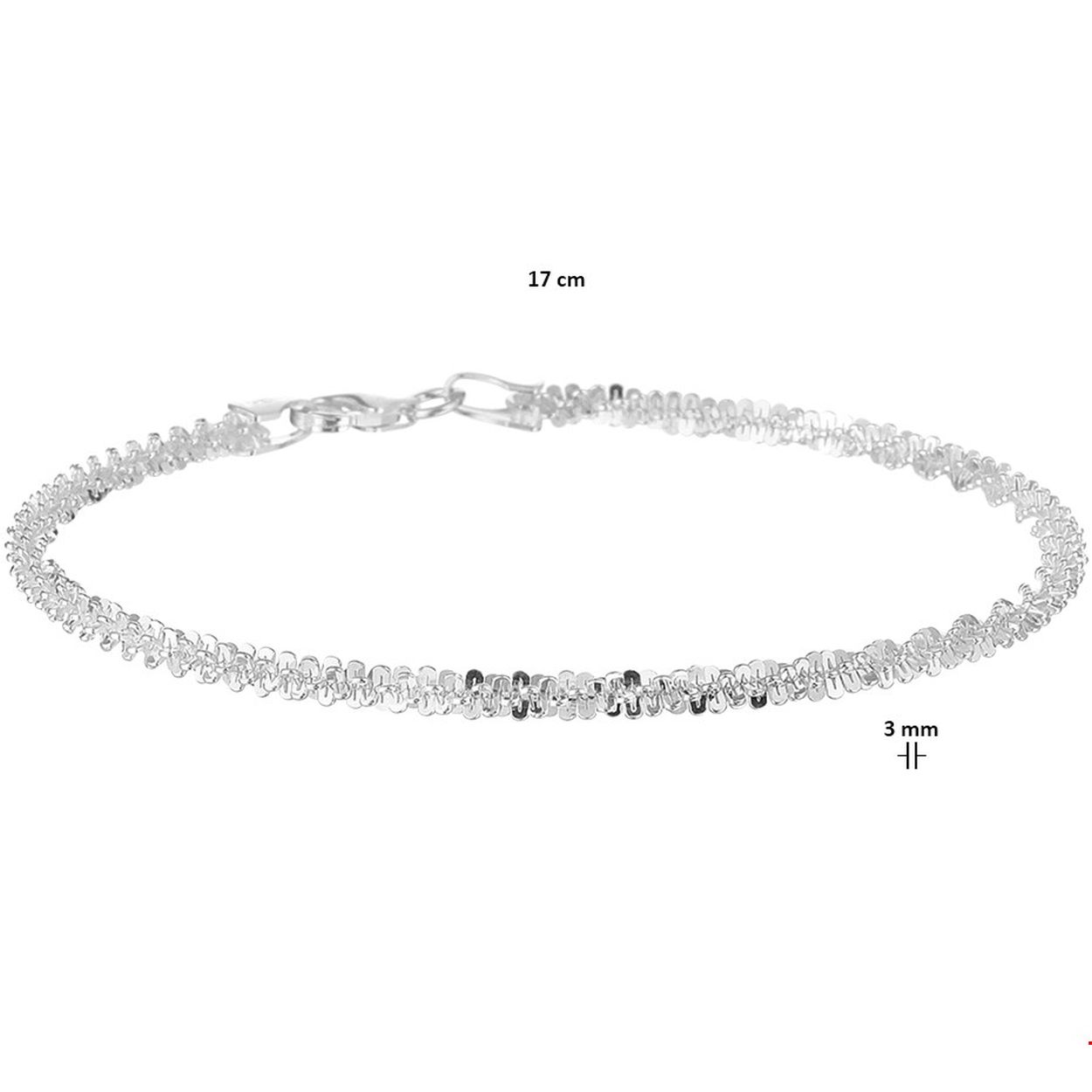 Beschrijving: Fijn zilveren 3mm gevlochten armband met een draaglengte van 17cm uitgevoerd met een stevige karabijn sluiting. De aparte schakel van deze armband en het fijne ontwerp geven uw outfit subtiel een elegante uitstraling. Tip: Combineer deze armband met bijpassende sieraden uit onze collectie en creeer zo een glamorous set!