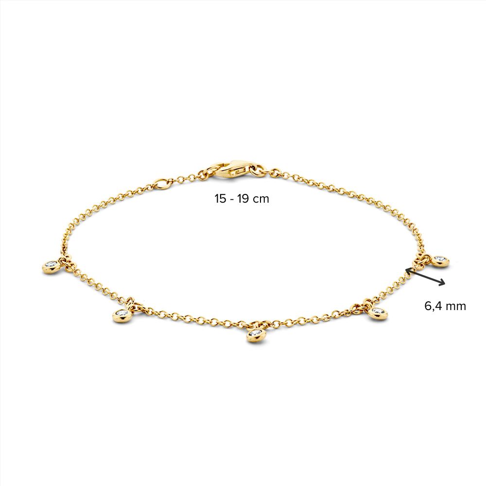 Geelgouden armband met 5 hangende diamanten in ronde zetkastjes.