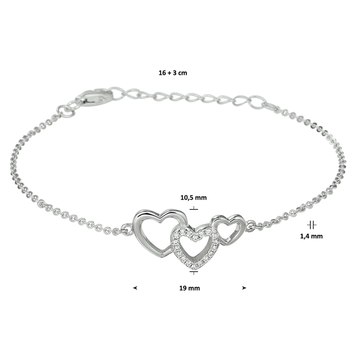 Beschrijving: Romantisch gerhodineerd zilveren armband met hartjes en schitterende zirkonia. Met een draaglengte van 16cm en een extensie van 3cm uitgevoerd met een stevige karabijn sluiting. Tip: Leuk om kado te geven! Info: Gerhodineerd zilver is door de rhodiumlaag beter bestand tegen verkleuren en krassen.