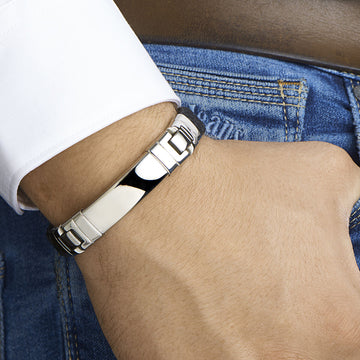 Stalen armband met gevlochten leer. De plaat heeft een dikte van 5.5mm. De schakelbreedte is 14.5mm.