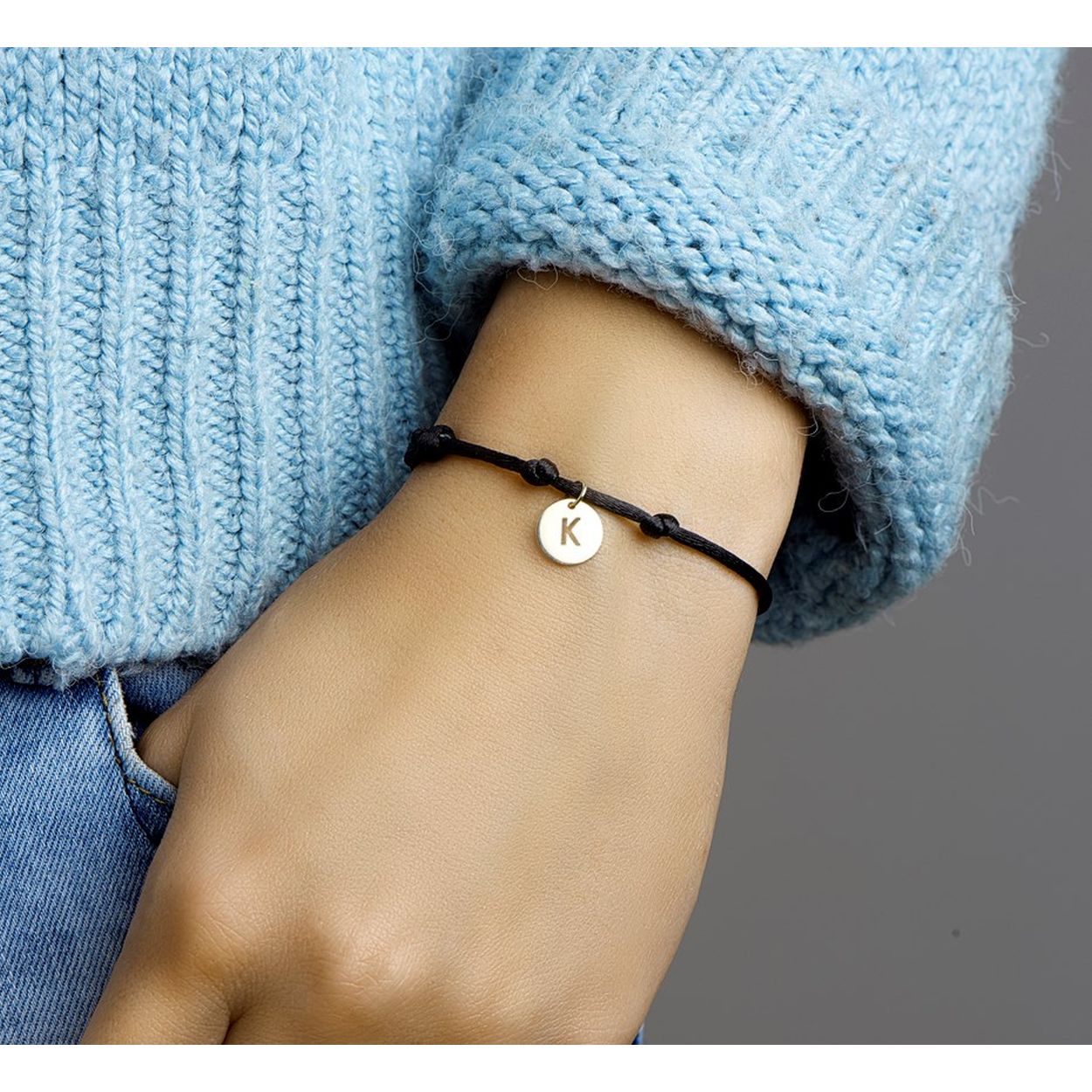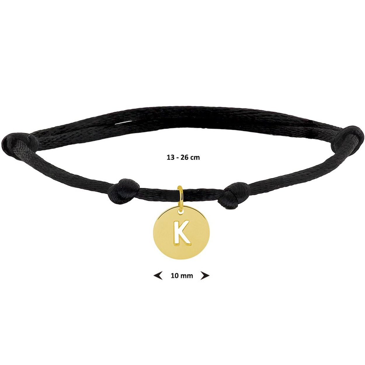 Zwart gevlochten armband uitgevoerd met een 14k geelgouden ronde letter K hanger. De armband heeft draaglengtes van 13 tot 26cm. De hanger heeft een totale hoogte van 1.3cm en een breedte van 10mm.