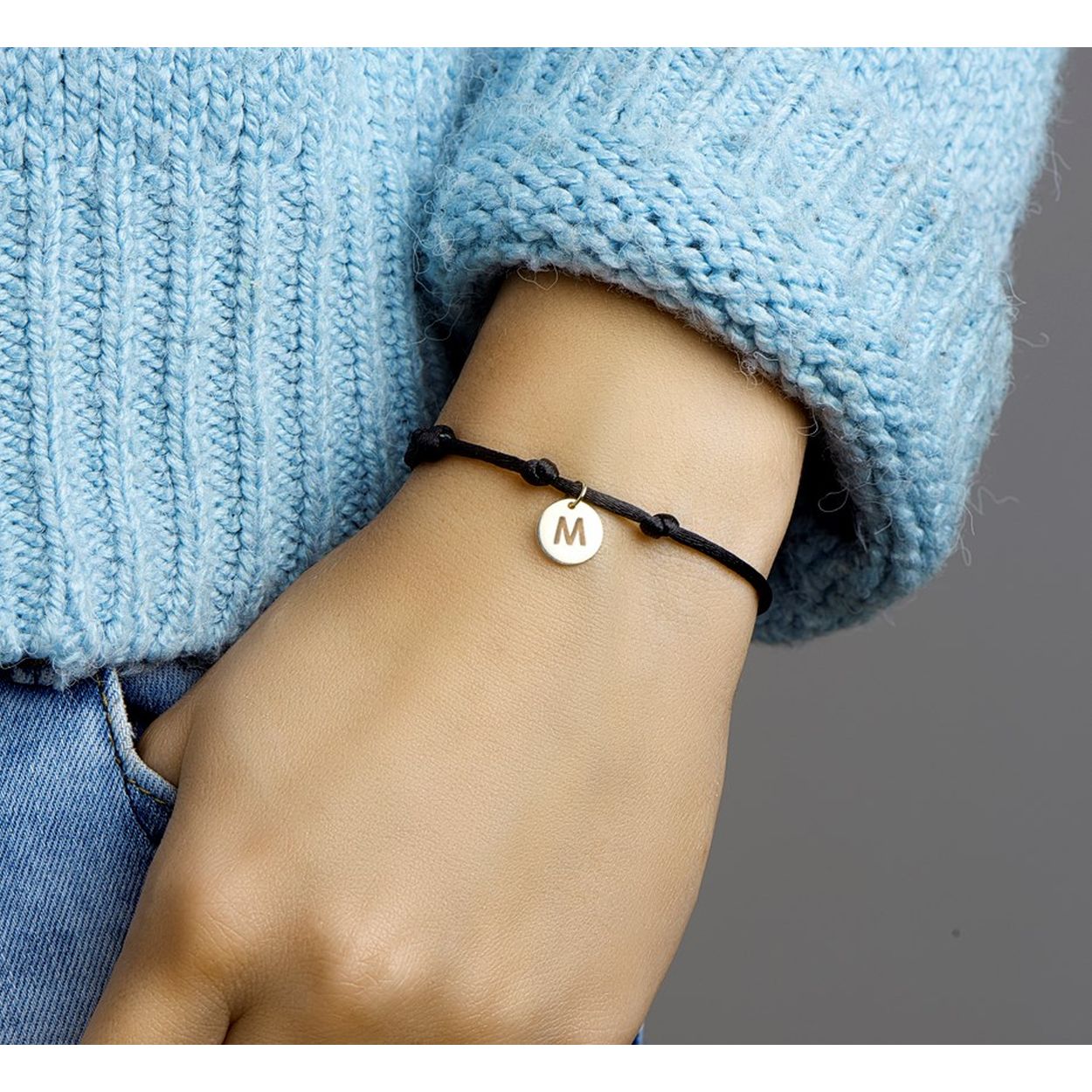 Zwart gevlochten armband uitgevoerd met een 14k geelgouden ronde letter M hanger. De armband heeft draaglengtes van 13 tot 26cm. De hanger heeft een totale hoogte van 1.3cm en een breedte van 10mm.