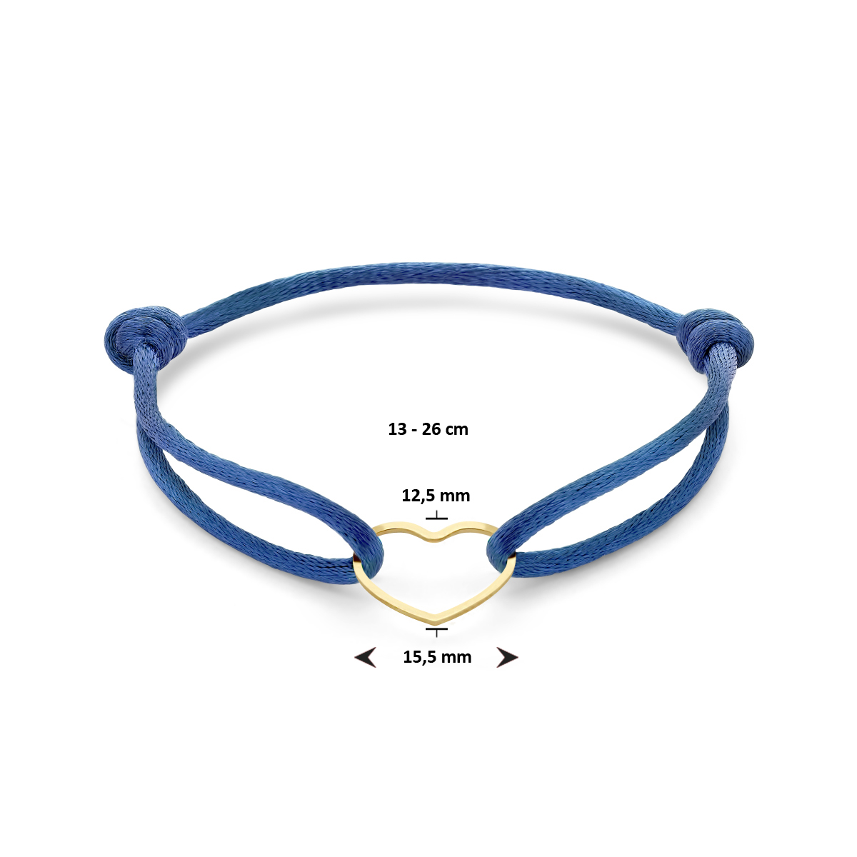 Blauw gevlochten armband uitgevoerd met geelgoud op 925 zilveren hartje. De armband heeft draaglengtes van 13 tot 26cm en het hartje heeft een afmeting van 12.5x15.5mm. Geen garantie op plating.