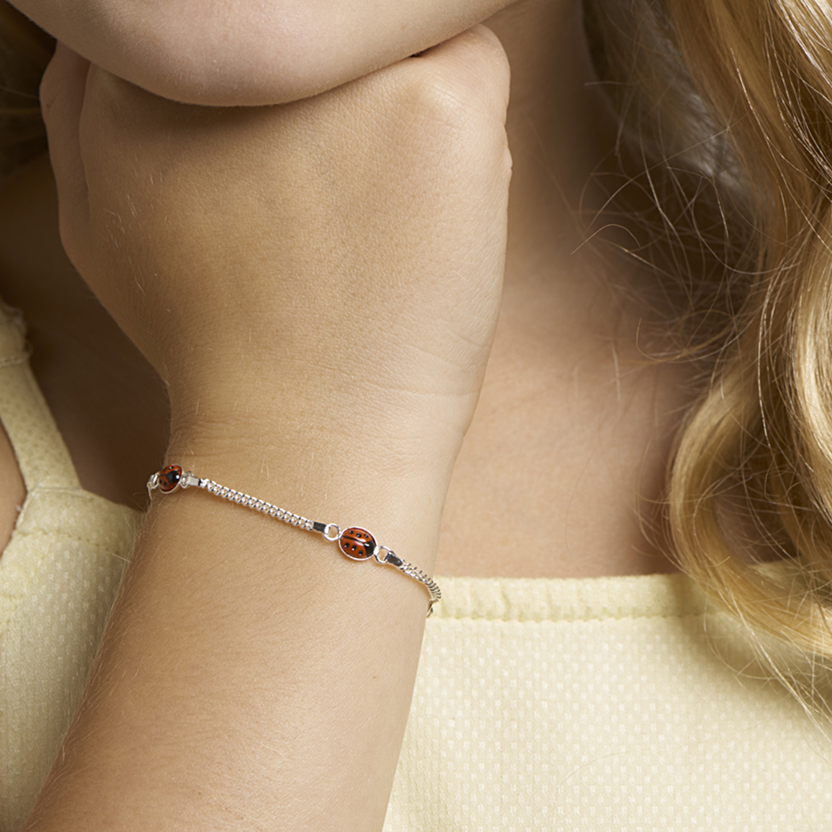 Beschrijving: Zilveren armband met lieveheersbeestjes. De lengte van de armband bedraagt 11cm met 2cm extensie.