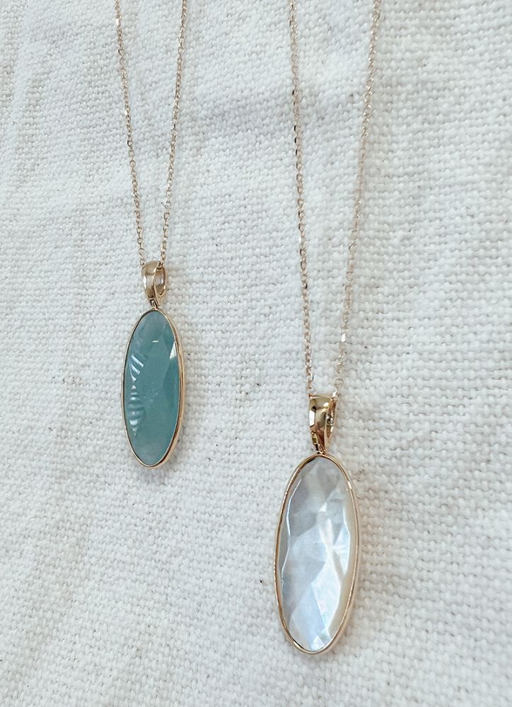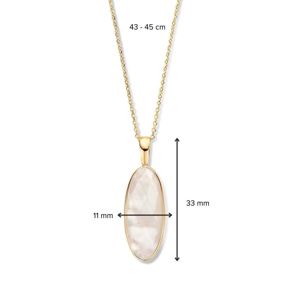 Geelgouden ketting met ankerschakel en prachtige ovale hanger gezet met gefacetteerd parelmoer.�