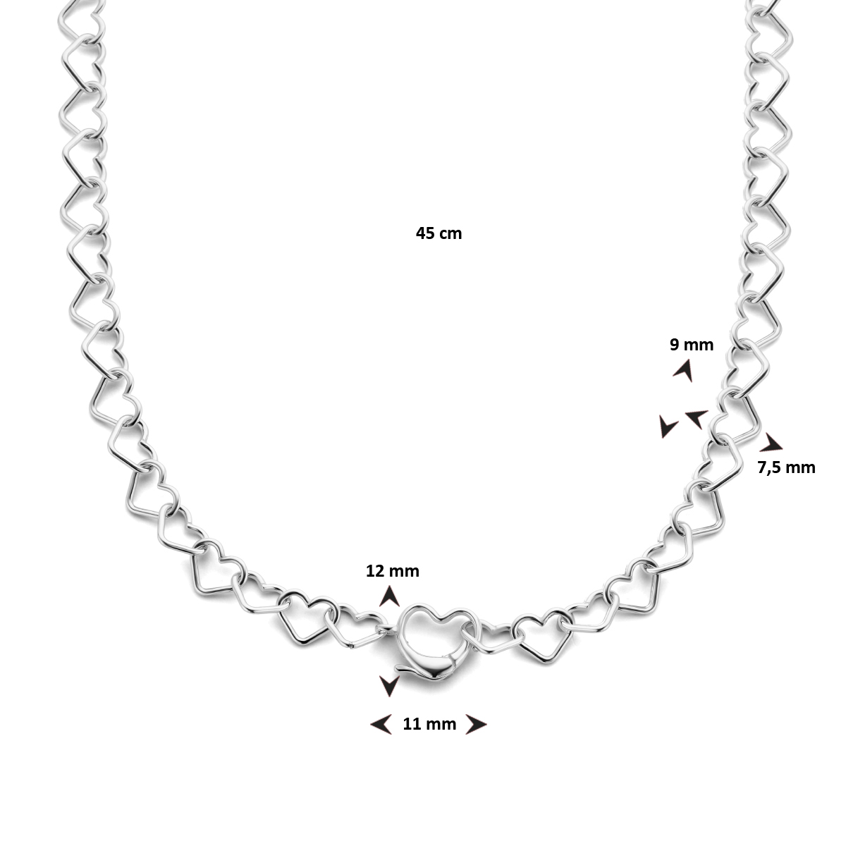 Gerhodineerd 925 zilveren collier uitgevoerd met een hartvormige schakel van 7.5x9.5mm. Het hartvormige slot heeft een afmeting van 11x12mm. Het collier heeft een draaglengte van 45cm.