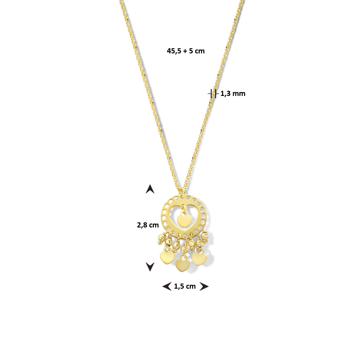 Geelgoud op 925 zilveren collier uitgevoerd met hartjes en een karabijn sluiting. Het collier heeft een draaglengte van 45,5cm en een extensie van 5cm. Geen garantie op plating.