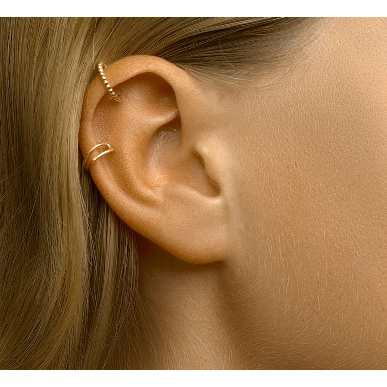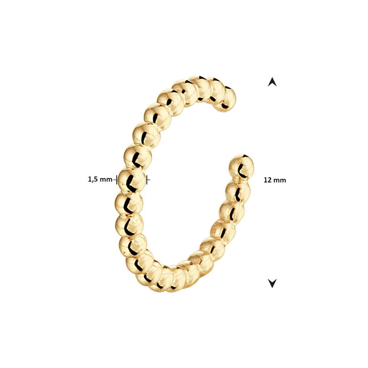 14k Geelgouden earcuff uitgevoerd met bolletjes. De earcuff heeft een afmeting van 12x1.5mm en wordt per stuk verkocht.
