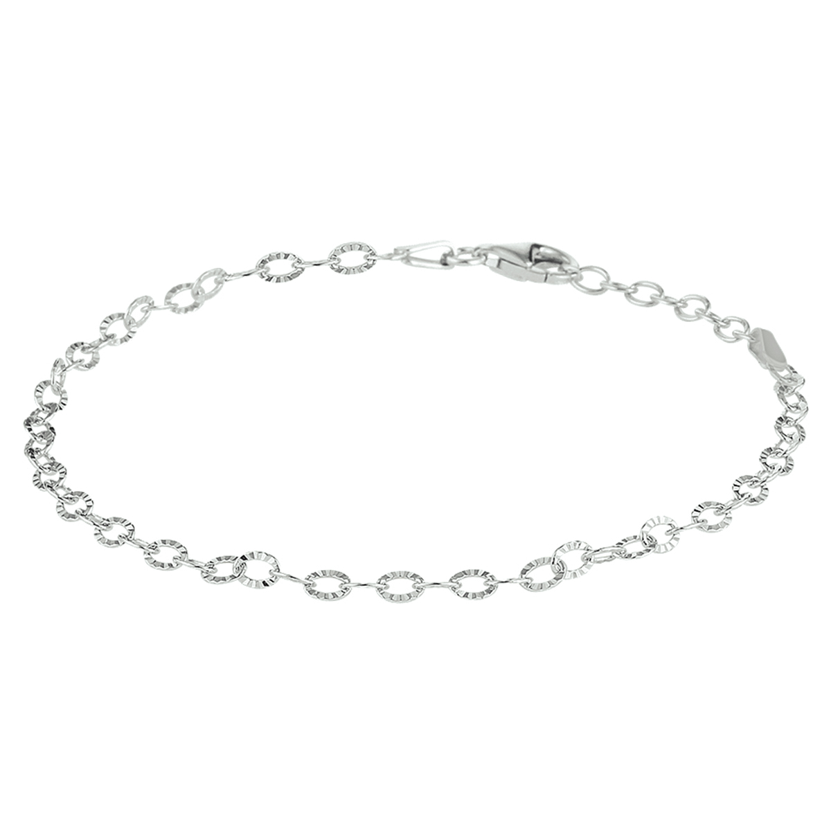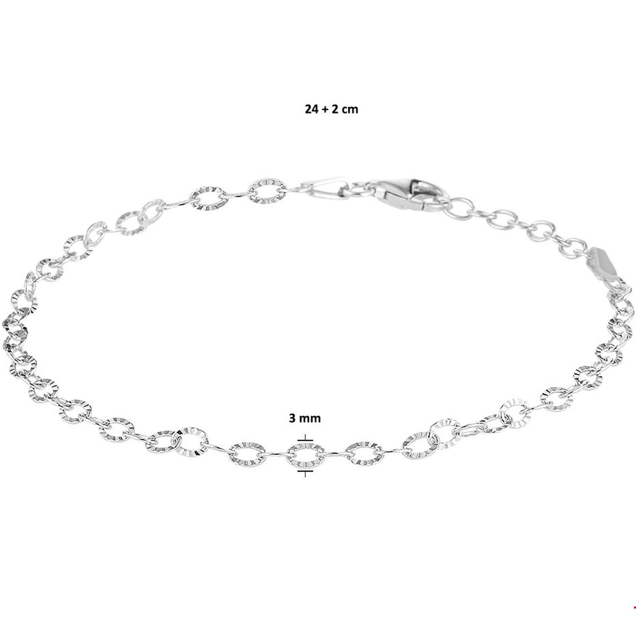 Beschrijving: Gerhodineerd zilveren enkelbandje uitgevoerd met een karabijn sluiting. Het enkelbandje heeft een draaglengte van 24cm en een extensie van 2cm. Info: Gerhodineerd zilver is door de rhodiumlaag beter bestand tegen verkleuren en krassen.