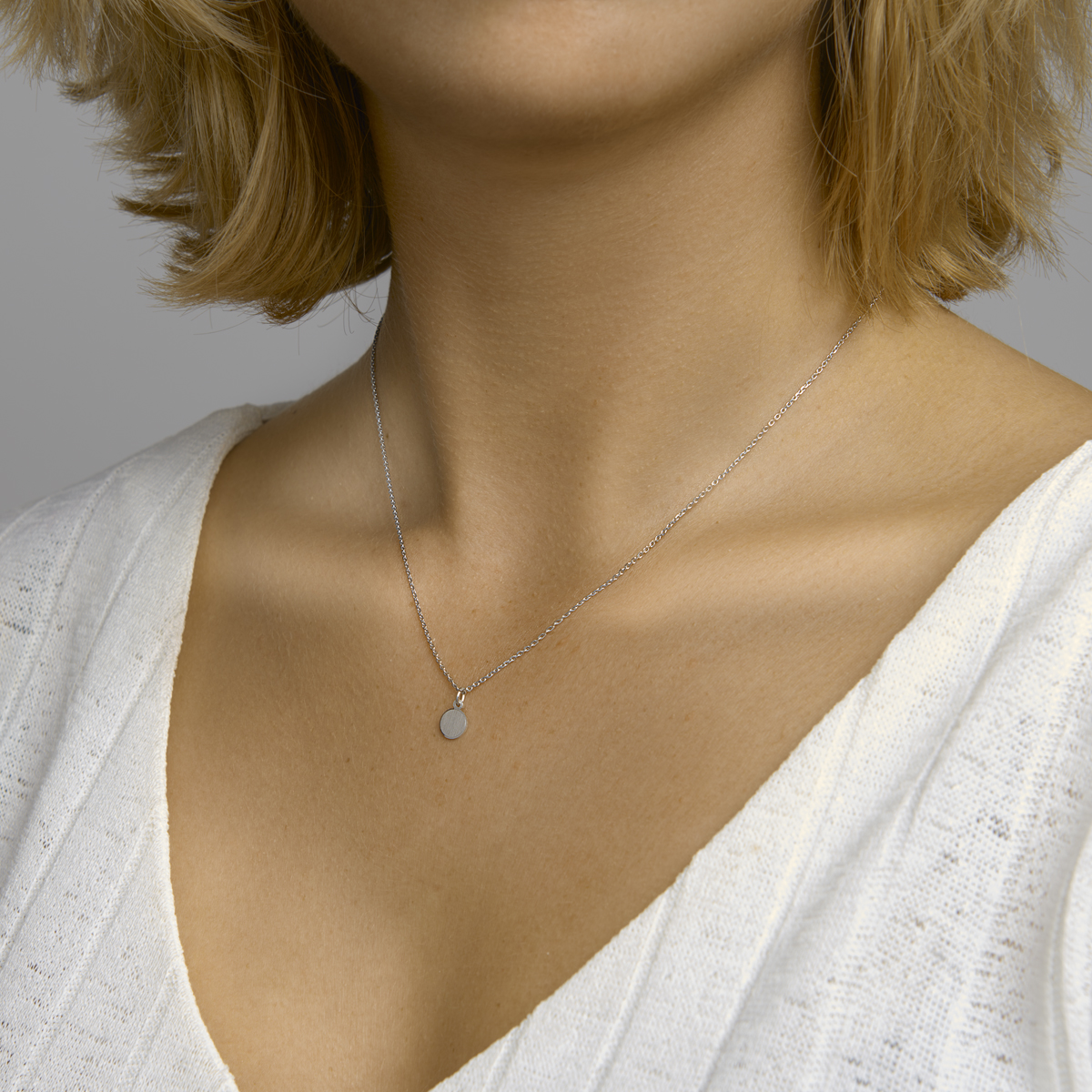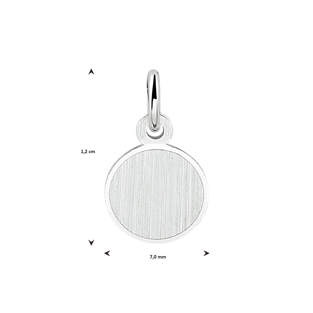 Gerhodineerd 925 zilveren ronde graveerhanger met een mat/gediamanteerde afwerking. De hanger heeft een totale hoogte van 1.2cm en een diameter van 7mm.