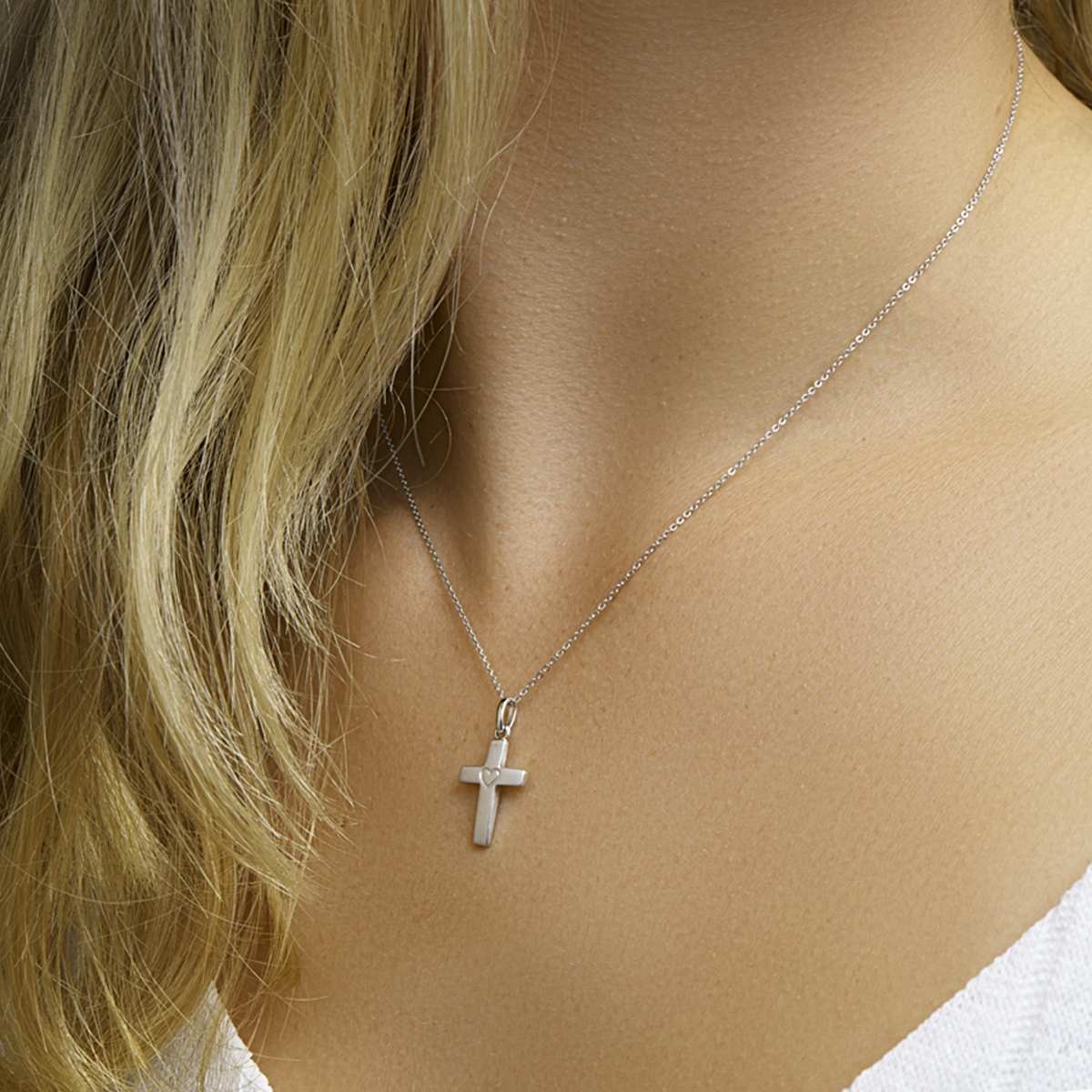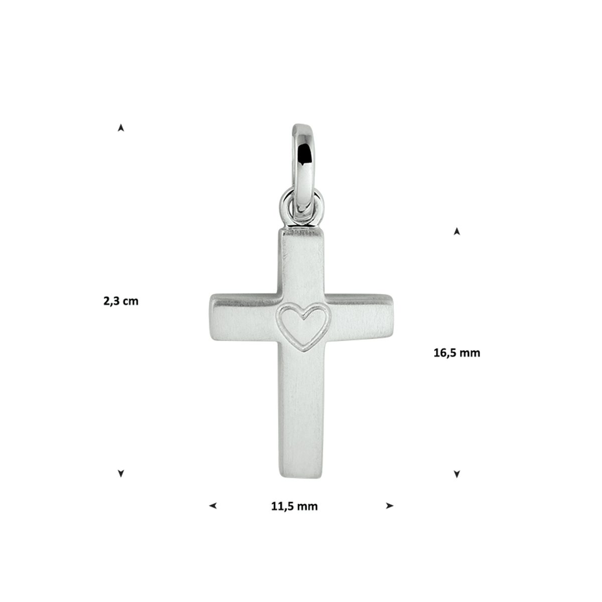 Gerhodineerd 925 zilveren hanger in de vorm van een kruis. In de hanger is een hartje gegraveerd. De totale hoogte van de hanger is 2.3cm. De afmeting van het kruis is 16.5x11.5mm.