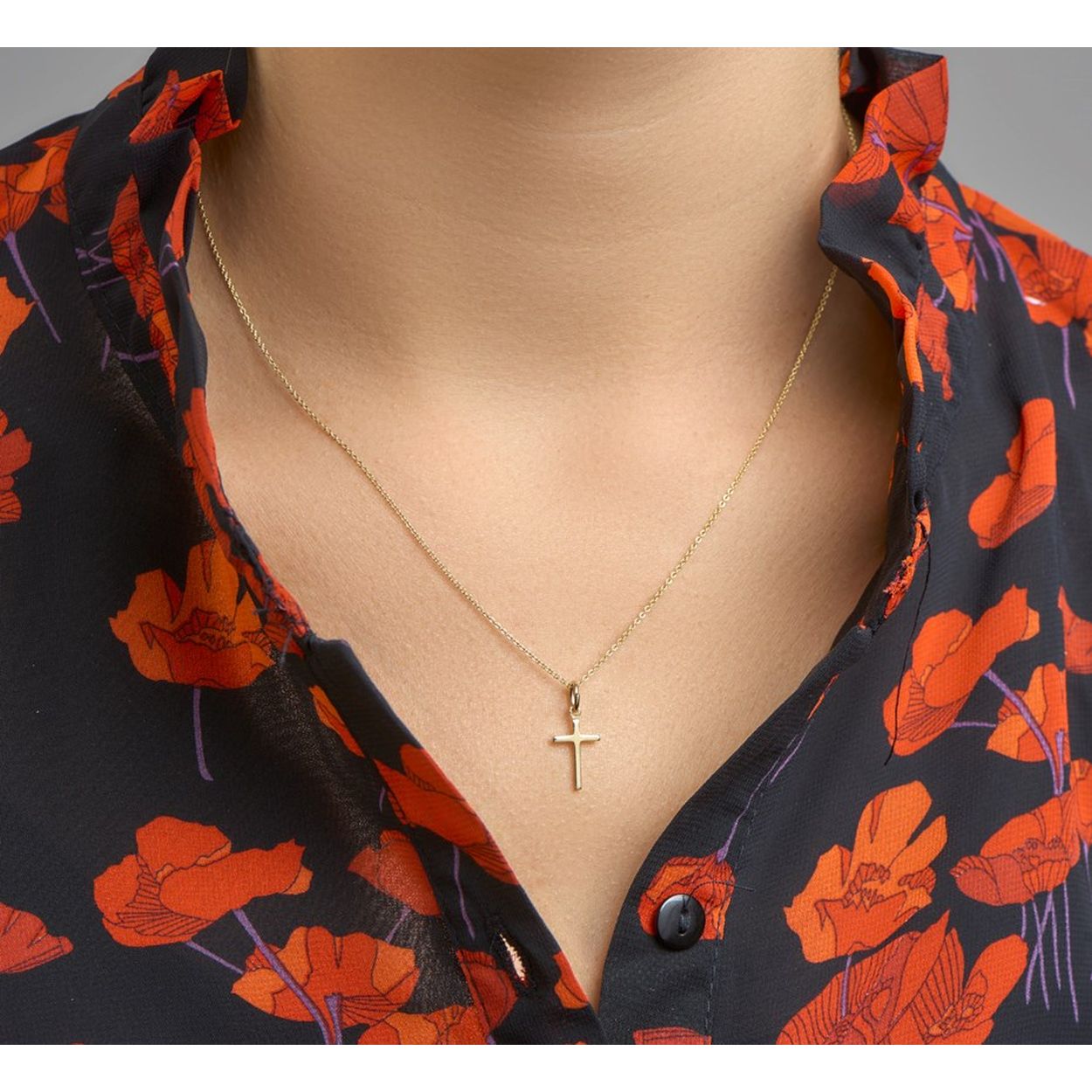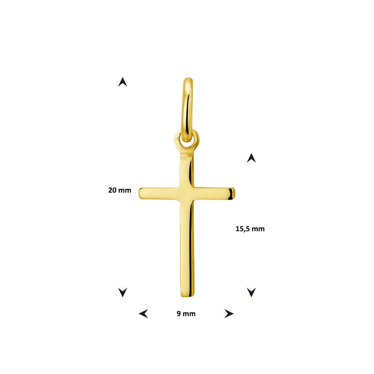 Geelgoud op 925 zilveren hanger in de vorm van een kruis. De hanger heeft een totale hoogte van 2cm en een breedte van 9mm.