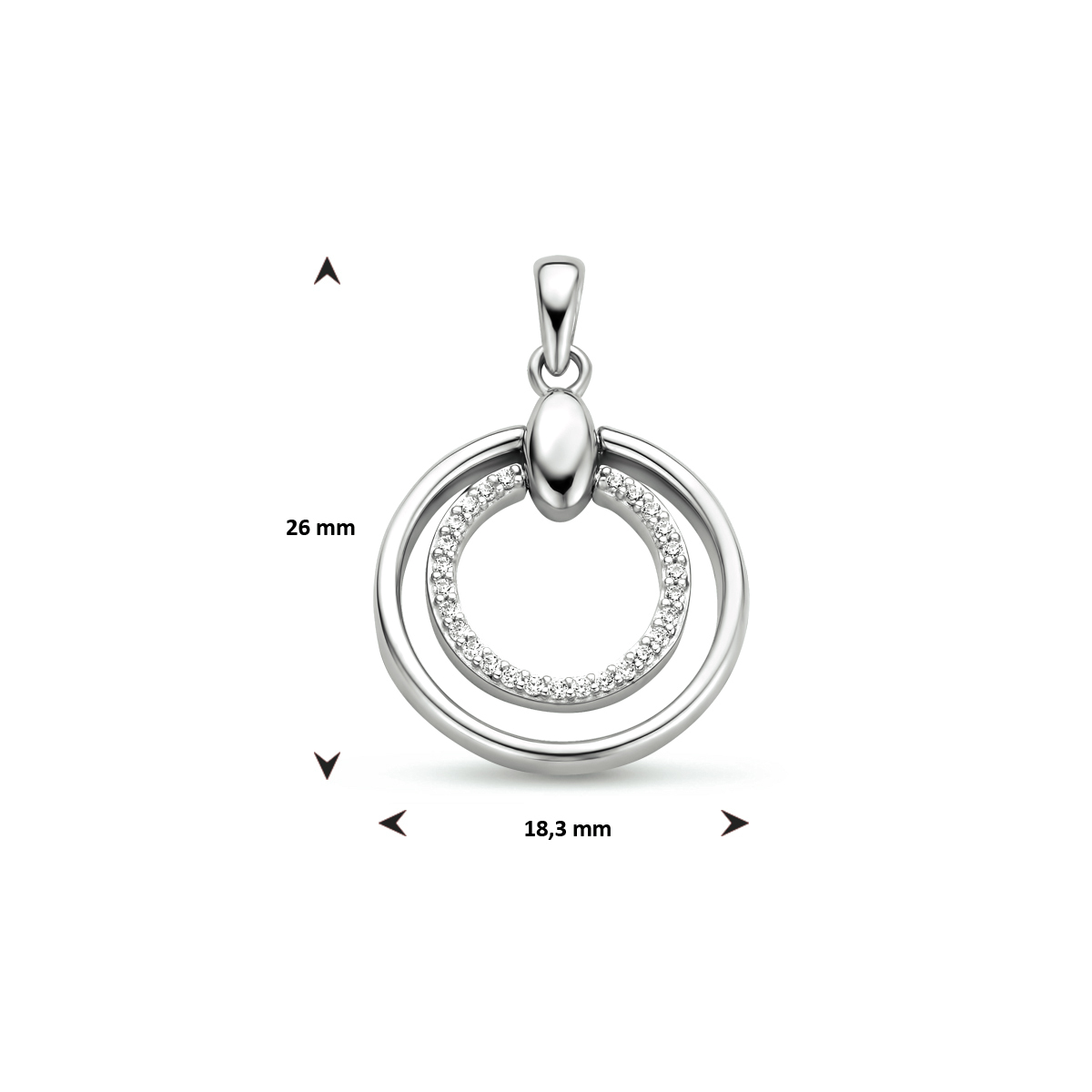 Gerhodineerd 925 zilveren hanger uitgevoerd met een schitterende zirkonia rij. De hanger heeft een totale hoogte van 2.6cm en een diameter van 18.3mm.