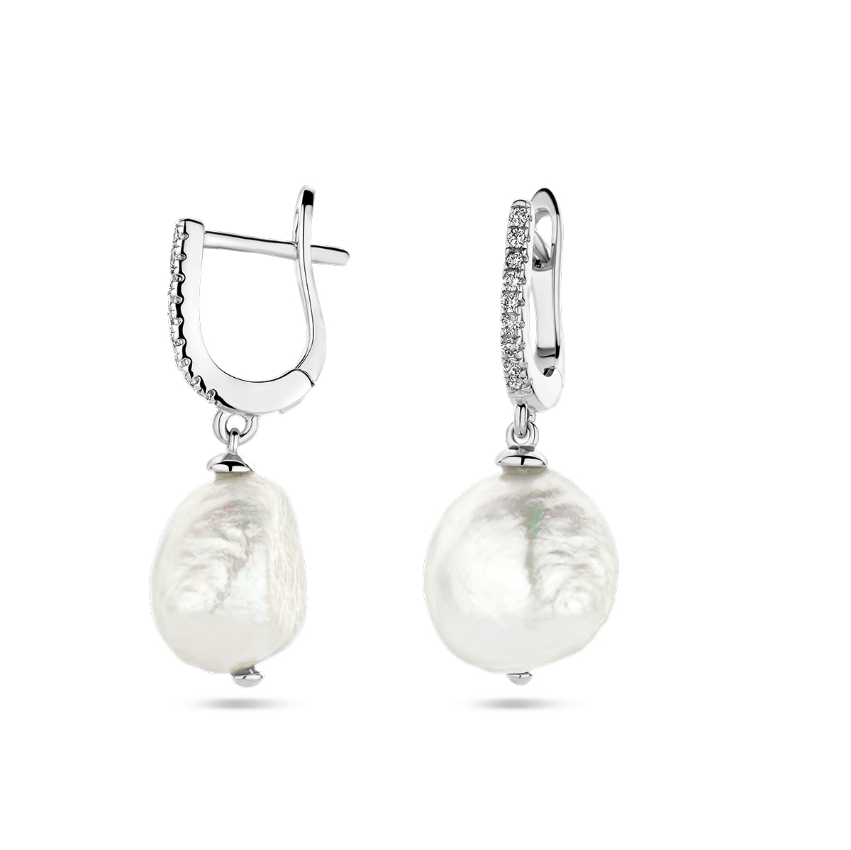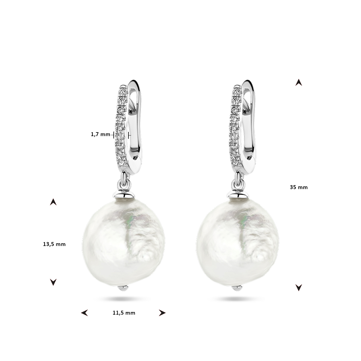 Gerhodineerd 925 zilveren klapoorringen uitgevoerd met een parel en zirkonia. De oorringen hebben een totale hoogte van 35mm.