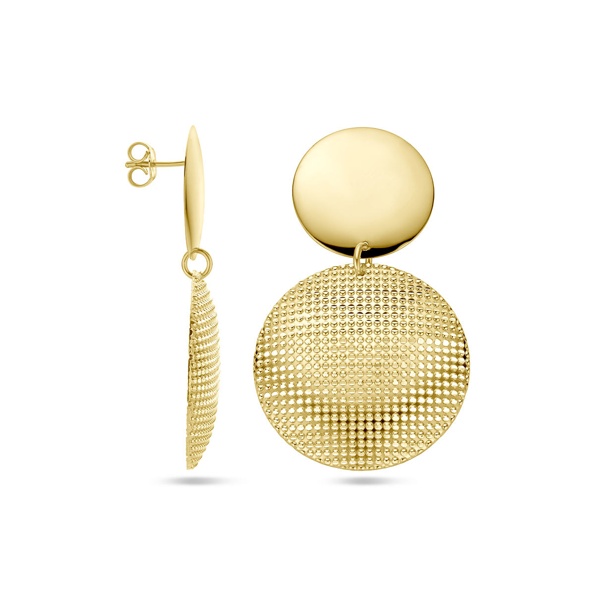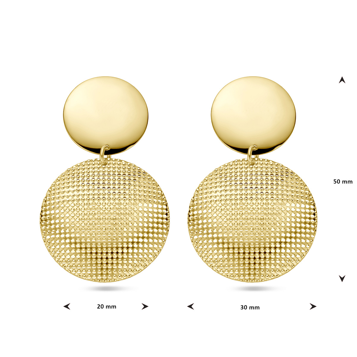 Geelgoud op 925 zilveren oorhangers met twee rondjes en een totale hoogte van 50mm. Geen garantie op de plating.