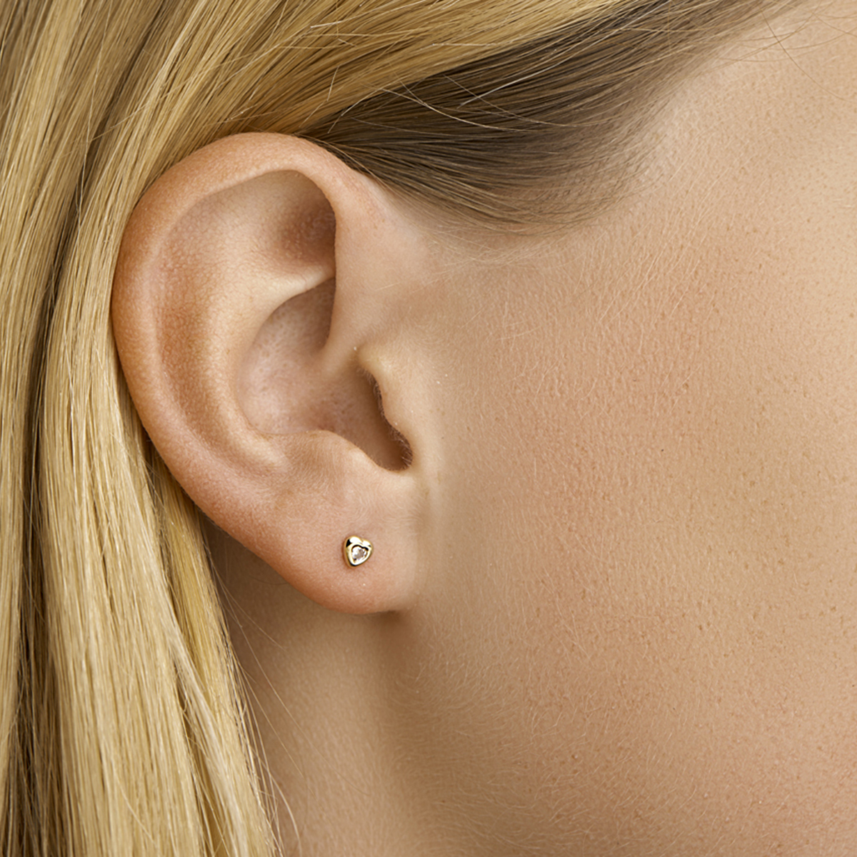 Beschrijving: Geelgouden oorknoppen met een hart en zirkonia.
