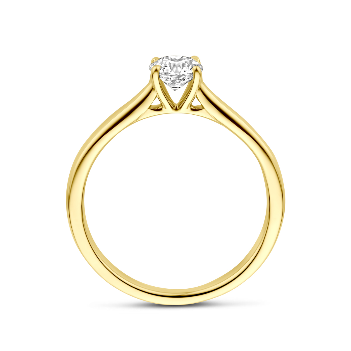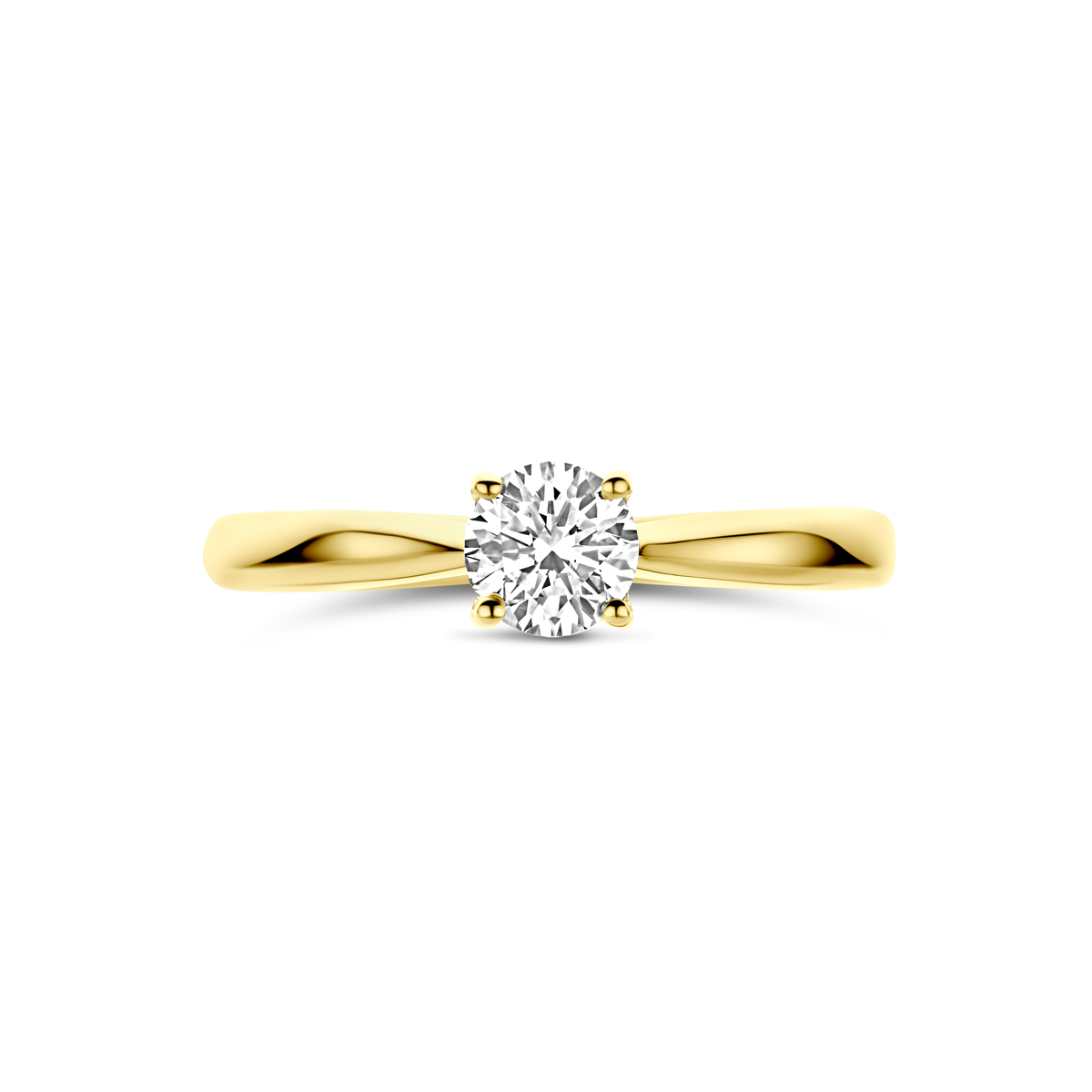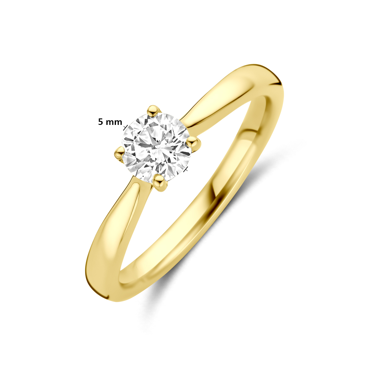14k Geelgouden ring uitgevoerd met lab grown diamant.De ring heeft een breedte van 5mm. Het diamantgewicht is 0,50ct. Lab grown diamanten zijn diamanten die ontstaan in een laboratorium. Onder extreem hoge druk en temperatuur wordt het natuurlijk ontstaansproces nagebootst met als eindresultaat een diamant met dezelfde chemische eigenschappen maar met een andere oorsprong.