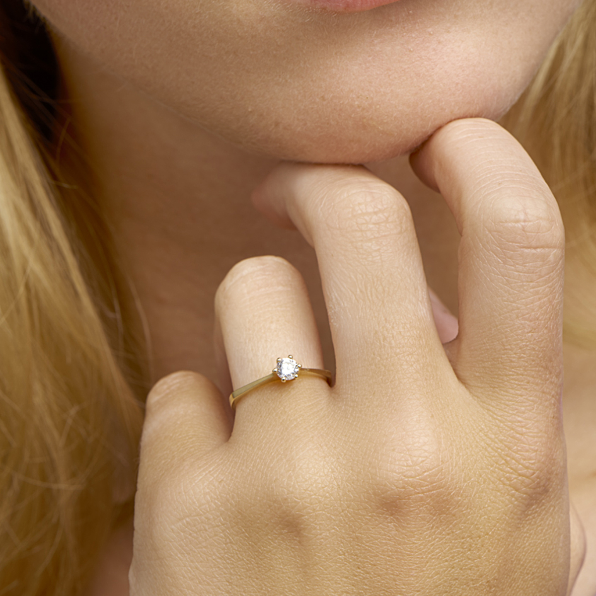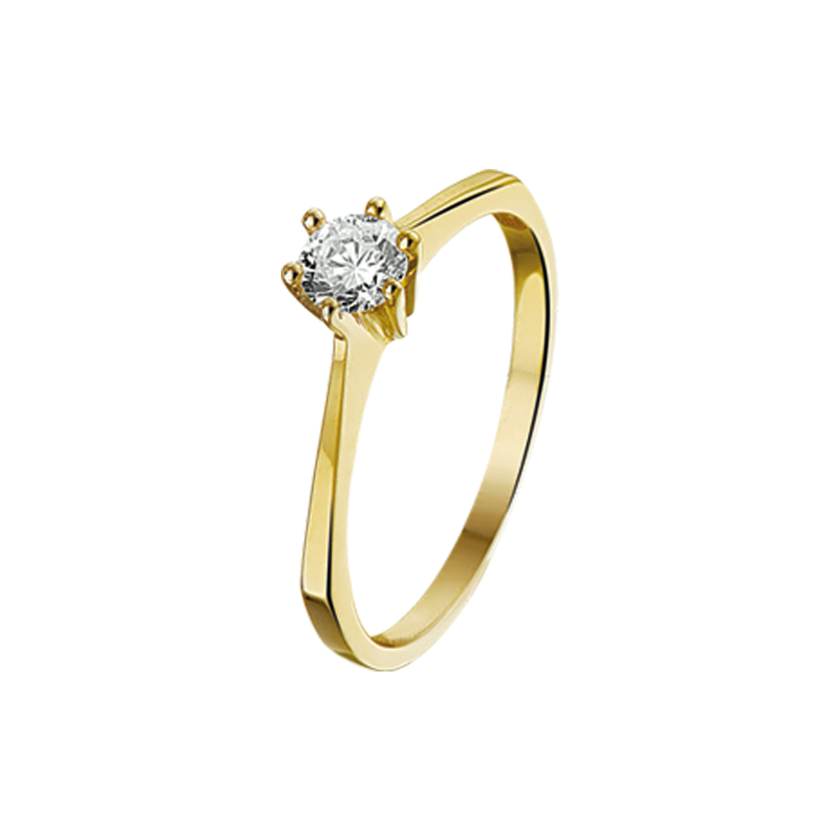Beschrijving: Een solitair gezette ring is de perfecte balans tussen klassiek en glamour. Mooi in zijn eenvoud. Details: Geelgouden ring met zirkonia.