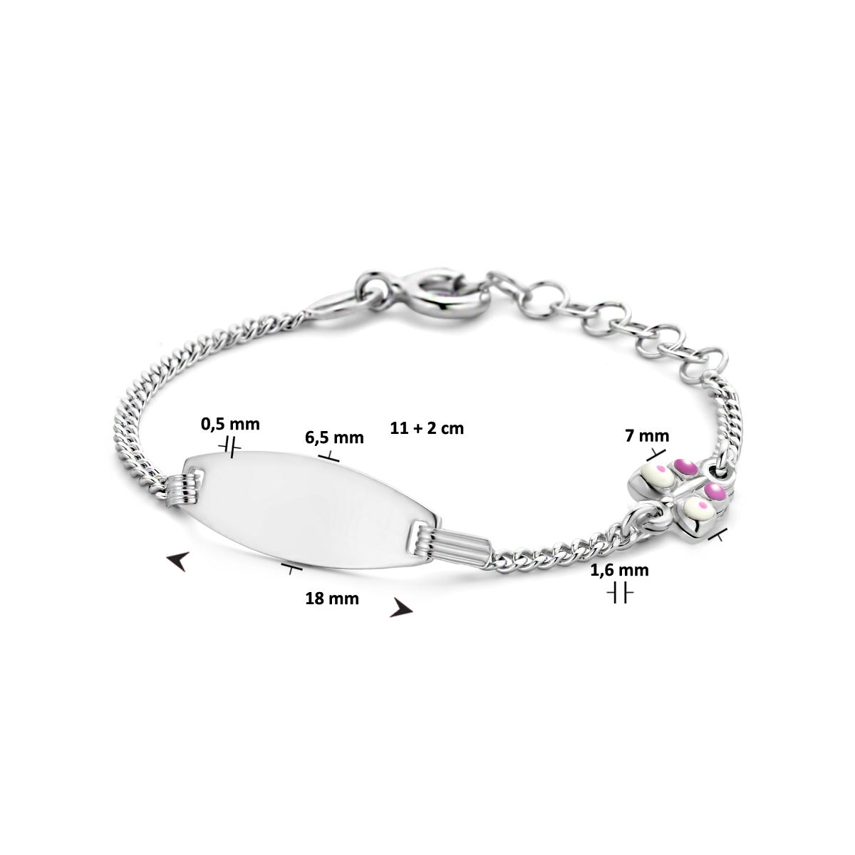 Gerhodineerd 925 zilveren graveerarmband uitgevoerd met een vlinder. De armband heeft een draaglengte van 11cm en een extensie van 2cm. De schakelbreedte is 1.6mm. De graveerplaat heeft een dikte van 0.5mm.